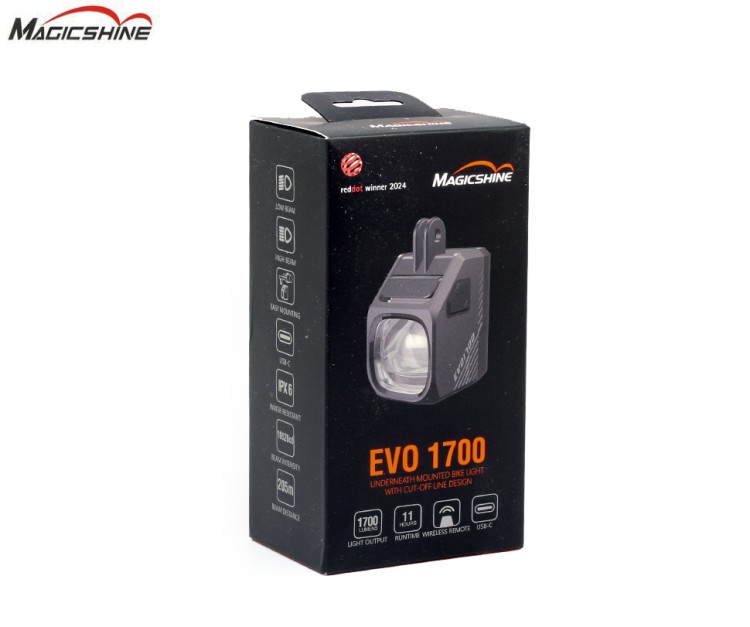 На печать Мощная светодиодная велофара Magicshine EVO 1700 Black от компании Magicshine (Меджикшайн) - фонарь для велосипеда максимальной мощностью 1700 люмен и дальностью 205 метров. EVO 1700 питается от встроенного Li-po аккумулятора ёмкостью 4000 мАч и заряжается от порта USB Type-C током 1 Ампер 5 В.